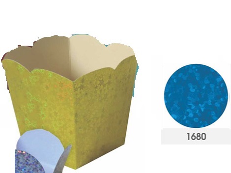CACHEPOT HOLOGRAFICO GLITER AZUL COMPOSICAO: PAPEL IMPONA 225G E PIGMENTOS ATOXICOS CARACTERISTICAS: CODIGO 1680 CACHEPOT PARA DOCES MATERIAL: PAPEL CARTAO, POLIPROPILENO (PLASTIFICACAO) E LAMINADO COLORIDO TAMANHO APROXIMADO: COMPR 8,5CM X LARG 7,2CM X ALT 9,5CM APROXIMADAS AS MEDIDAS