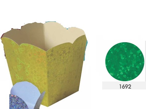 CACHEPOT HOLOGRAFICO VERDE COMPOSICAO: PAPEL IMPONA 225G E PIGMENTOS ATOXICOS CARACTERISTICAS: CODIGO 1692 CACHEPOT PARA DOCES MATERIAL: PAPEL CARTAO, POLIPROPILENO (PLASTIFICACAO) E LAMINADO COLORIDO TAMANHO APROXIMADO: COMPR 8,5CM X LARG 7,2CM X ALT 9,5CM APROXIMADAS AS MEDIDAS