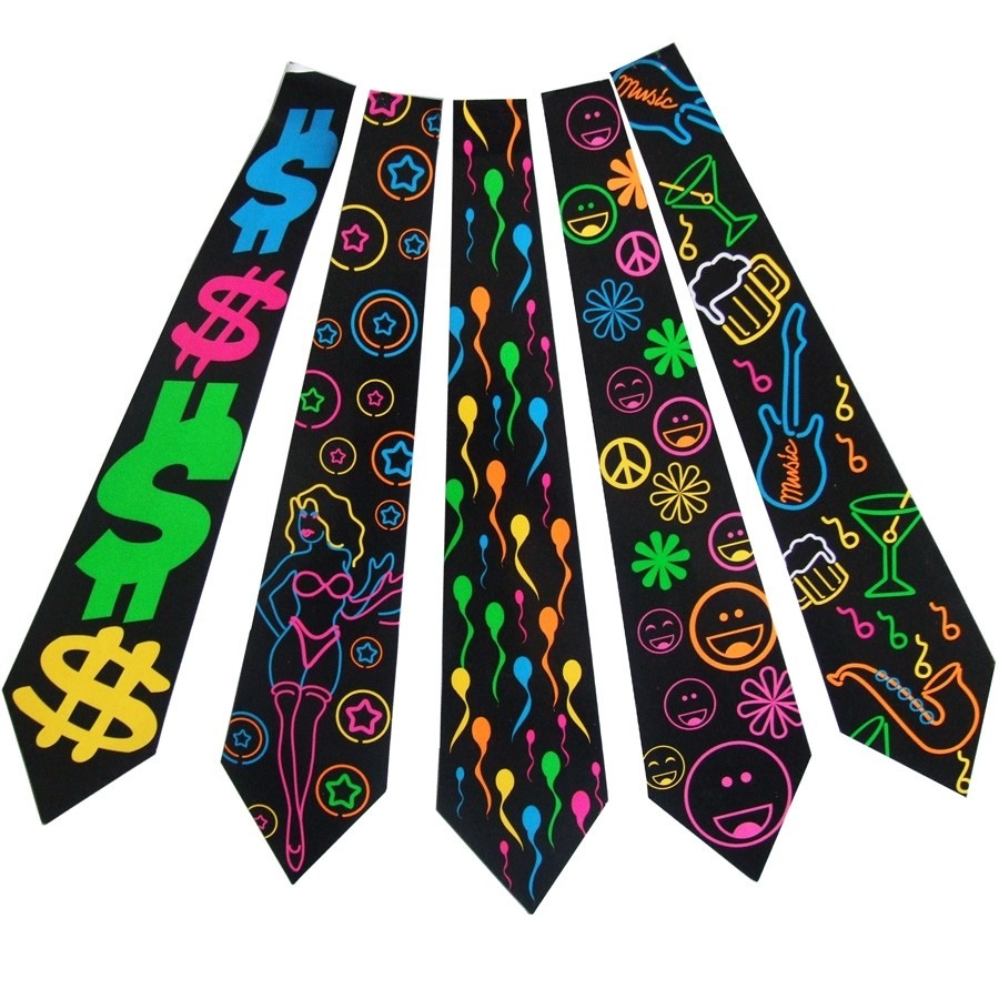 GRAVATA NEON EMBALAGEM COM 10 UNIDADES MATERIAL: PAPEL CARTONADO MEDIDAS APROXIMADAS: 41 CM DE ALTURA X 8,5 CM DE LARGURA *BRILHA SOMENTE COM PRESENCA DE LUZ NEGRA