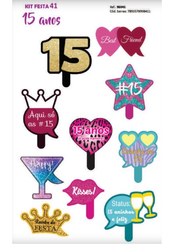 REFERENCIA: 98041 KIT FESTA 41 SAO 10 PLAQUINHAS PARA FESTA, CADA UMA CONTEM UMA FRASE BRINCALHONA E BEM ILUSTRADA, SAO CORES, FIGURAS E FONTES DIVERTIDAS, TODOS ESSES ELEMENTOS GARANTEM TIRAR SEFIES CRIATIVAS PARA OS CONVIDADOS POSTAREM EM SUAS REDES SOCIAIS O MATERIAL E FEITO DE PAPEL CARTONADO DE QUALIDADE E RECORTADOS EM FORMATOS DE CORACAO E BALOES DE DIALOGOS GARANTA MAIS ENTRETENIMENTO PARA OS CONVIDADOS E FIQUE A VONTADE PARA CONHECER OUTROS PRODUTOS, TEMOS UMA IMENSA VARIEDADE DE ARTIGOS PARA EVENTOS E FESTAS APROVEITE! EVENTOS INDICADOS: COMBINAM MUITO BEM COM FESTA DE ANIVERSARIO, FORMATURA, CASAMENTO, FESTA UNIVERSITARIA E BALADA MATERIAL: CARTONADO PAPEL TRIPLEX TAMANHO:20 CM X 20 CM MEDIDAS APROXIMADAS MIX CONTENDO AS FRASES DIFERENTES NAS PLAQUINHAS: 15 CARINHA DE 15 BEST FRIEND 15 ANOS JA PODE NAMORAR AQUI SO AS #15 HAPPY KISSES!! RAINHA DA FESTA STATUS 15 ANINHOS E FELIZ # 15