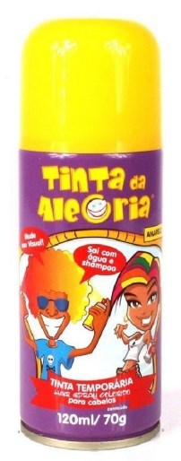 REFERENCIA: BR287AM A TINTA DA ALEGRIA DEIXA SEUS CABELOS COLORIDOS E PARA RETIRALA BASTA LAVALOS COM AGUA E SHAMPOO ELA PODE SER UTILIZADA EM DIVERSAS OCASIOES COMO: FESTAS, COMEMORACOES ESPORTIVAS, CARNAVAL ETC MODO DE USAR: AGITE BEM A EMBALAGEM ANTES E DURANTE O USO APLIQUE O PRODUTO SEGURANDO A LATA NA POSICAO VERTICAL A 20 CM DO CABELO VOLUME DO SPRAY: 120 ML70G PRODUTO NAO CONTEM CFC PESO TOTAL: 0,133 KG