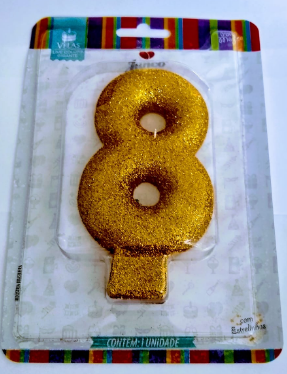 VELA ANIVERSARIO GIGANTE GLITER DOURADA N8 1 UNIDADE VELA DE ANIVERSARIO NO FORMATO DO NUMERO 8 COM GLITTER DOURADO A VELA TEM 12,5CM DE ALTURA X 6,5CM DE LARGURA COMPOSICAO: PARAFINA, PLASTICO, FIO DE ALGODAO E PIGMENTOS ATOXICOS