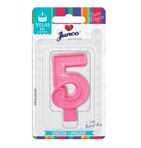 VELA ANIVERSARIO N 05 ROSA VELA DE ANIVERSARIO BIG NUMERO PAVIO MAGICO COM ESTRELINHAS TAMANHO: 4X7X1CM (CXAXL) CARTELA COM 1 UNIDADE SEM PERSONALIZACAO FABRICANTE: JUNCO COMPOSICAO: PARAFINA, ANILINA, MAGNESIO METALICO,GLITER E FIO DE ALGODAO