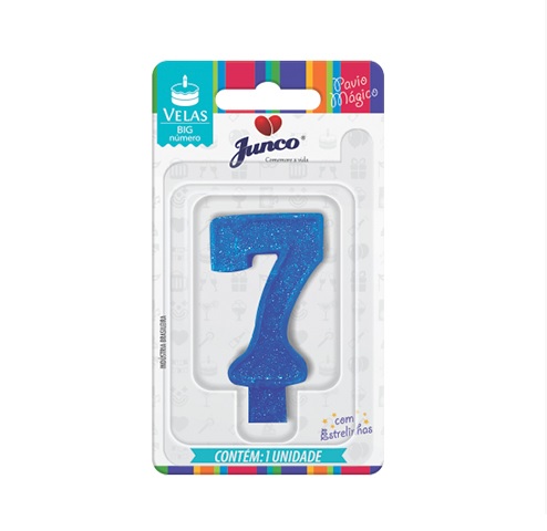 VELA ANIVERSARIO N 07 AZUL VELA DE ANIVERSARIO BIG NUMERO PAVIO MAGICO COM ESTRELINHAS TAMANHO: 4X7X1CM (CXAXL) CARTELA COM 1 UNIDADE SEM PERSONALIZACAO FABRICANTE: JUNCO COMPOSICAO: PARAFINA, ANILINA, MAGNESIO METALICO,GLITER E FIO DE ALGODAO
