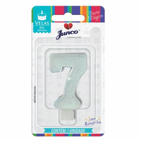 VELA ANIVERSARIO N 07 BRANCA VELA DE ANIVERSARIO BIG NUMERO PAVIO MAGICO COM ESTRELINHAS TAMANHO: 4X7X1CM (CXAXL) CARTELA COM 1 UNIDADE SEM PERSONALIZACAO FABRICANTE: JUNCO COMPOSICAO: PARAFINA, ANILINA, MAGNESIO METALICO,GLITER E FIO DE ALGODAO